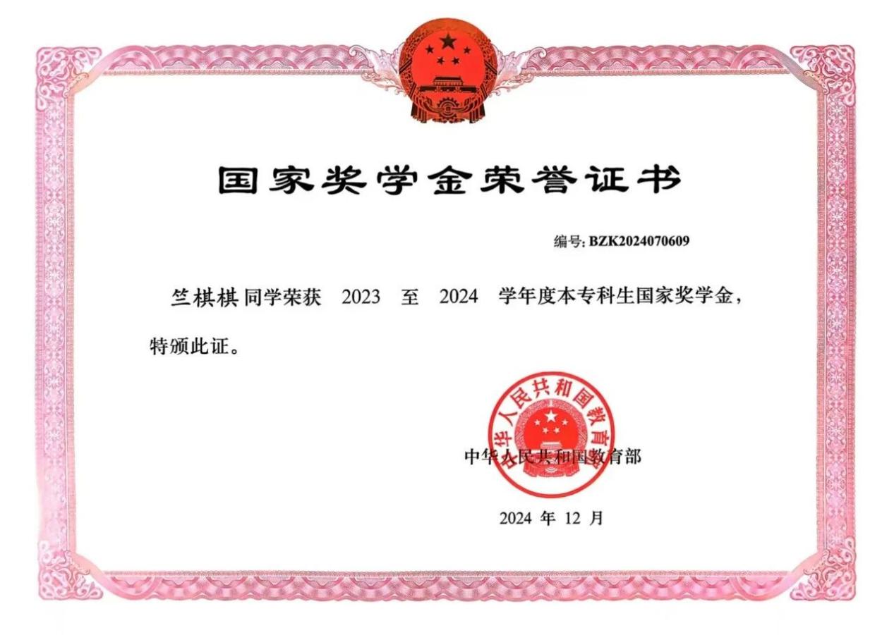 在学习上,从进入大学起,她一直把学习放在首位,清晰的意识到大学学习的自主性,因此,她始终坚持“今日事,今日毕”的原则,积极投入到各门基础课和专业课的学习中,给自己明确学习目标并端正学习态度。正因为如此,在2023-2024学年获得国家奖学金并连续两年获校级一等奖学金。在学好课本知识的同时,她还经常参加各类活动,不断提高自己的综合素质。参加“挑战杯”全国大学生课外学术科技作品竞赛、全国数智商业生态运营大赛等,获得国家级奖项4项,省级奖项6项。在数智商业生态运营大赛中,作为团队负责人的她,带领团队成员深入实践,提出了创新性的解决方案,最终荣获金奖。