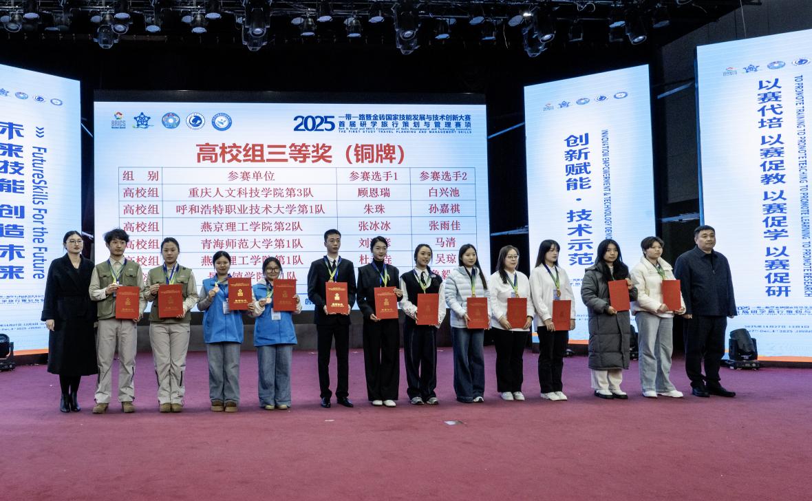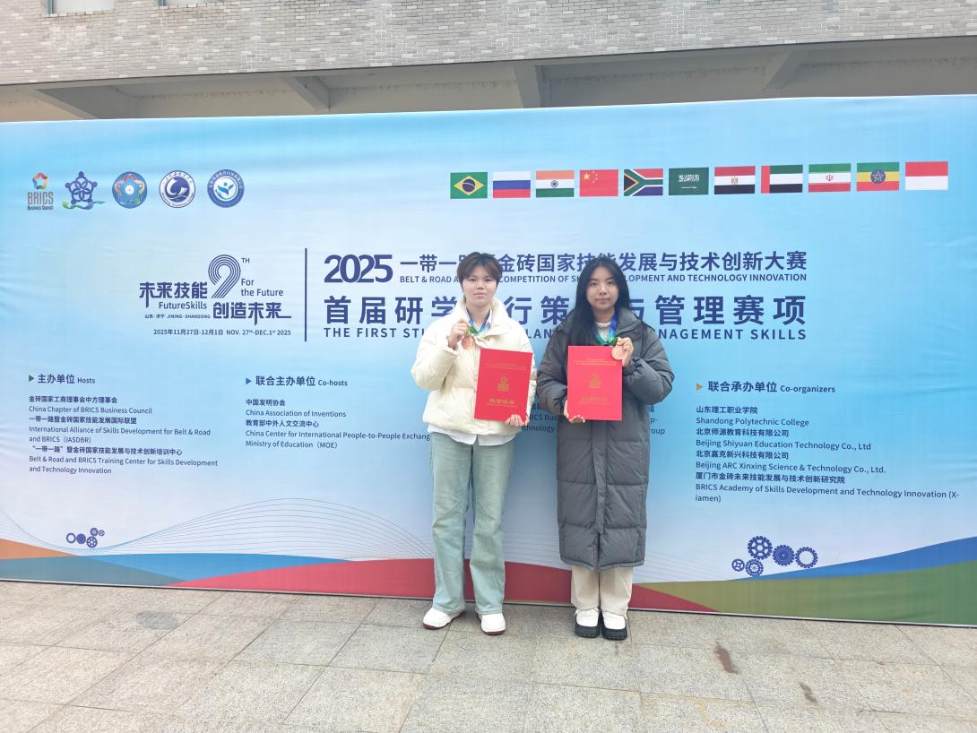 12月1日,在刚刚落幕的2025年“一带一路”暨金砖国家技能发展与技术创新大赛首届研学旅行策划与管理赛项全国总决赛中,景德镇学院经管学子再传捷报!由鲁毅欣、郑亦畅两位同学组成的队伍,在杨丽华、刘瑜辉老师的倾心指导下,凭借出色的综合素养与创新的策划能力,在激烈角逐中脱颖而出,荣获全国总决赛高校组三等奖!这不仅是一枚沉甸甸的奖牌,更是我校深化实践教学、推动文旅融合人才培养的生动注脚。