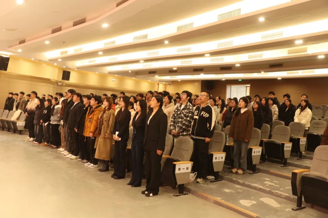 全体起立,奏唱国歌。在雄壮激昂的《义勇军进行曲》中,大会正式拉开帷幕。庄严的旋律响彻会场,也标志着本次学生代表大会在隆重、肃穆的氛围中正式启幕。