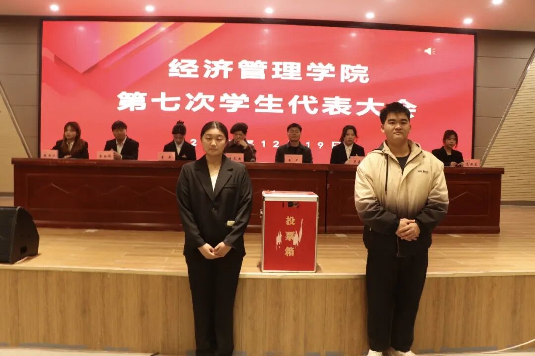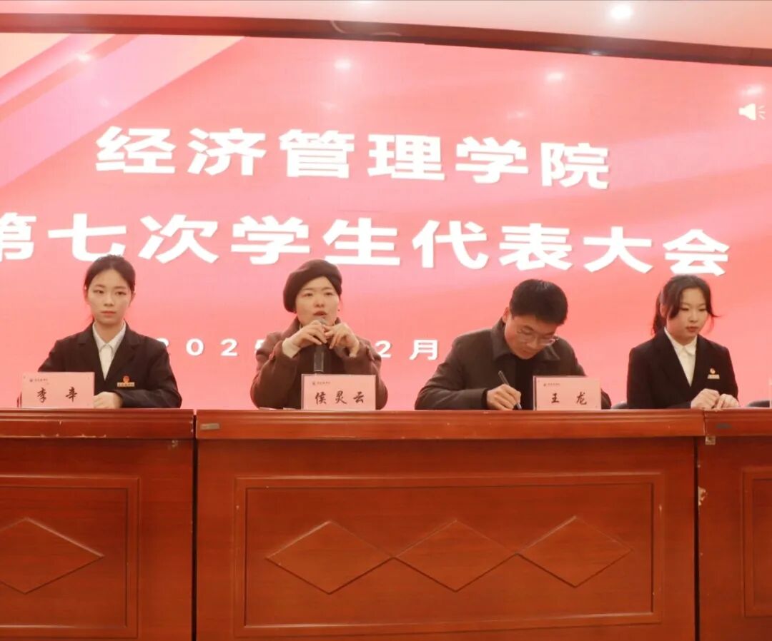 (本网讯:丁清怡)为深入贯彻党的二十届四中全会精神,落实新时代立德树人根本任务,进一步加强学生组织建设,提升学生自我管理、自我教育、自我服务能力,经济管理学院于2025年12月19日下午4点在图文报告厅隆重召开第七次学生代表大会。学院党委副书记候灵云、院团委副书记王龙及学生代表出席会议,大会由学生代表林佳缘主持。